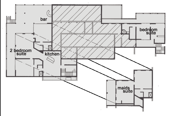 | Right: The main floor plan. Additional Plans Red areas are kitchens / bars. Orange areas are tiled outdoor spaces. The grayed orange areas are indoor / outdoor covered spaces. The pool also has a covered area, shown in light blue |